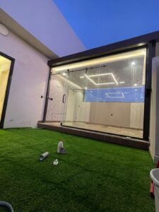 - دمج غرف من زجاج مع حديقة السطح بفرش العشب الصناعي الفاخر وتوزيع الإضاءة الأرضية الساحرة.